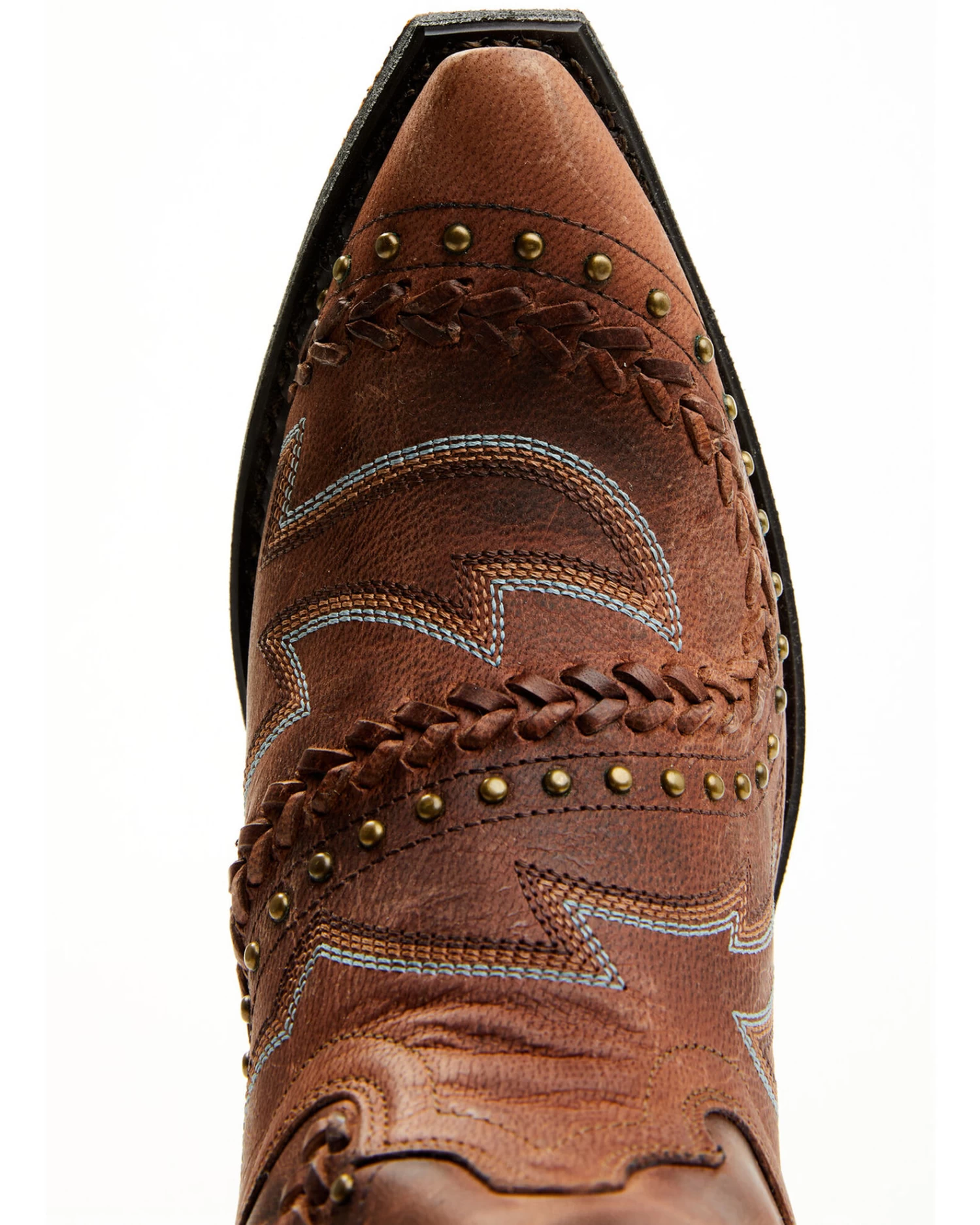 - Studded, woven lace-up, and western stitched pattern on shaft